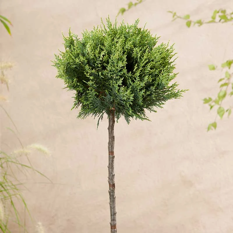 Ädelcypress ‘White Spot’ är en uppstamad liten cypress som passar utmärkt i en kruka vid entré. Mycket dekorativt barrväxt med elegant form. Barr är mjuka och blågrön med krämfärgade skottspetsar. Vintergrön. Sorten är långsamväxande med pelarformigt växtsätt. Sorten är odlad på en låg stam.