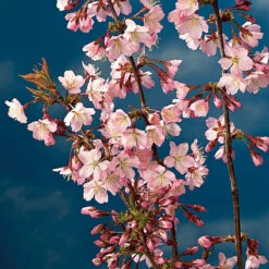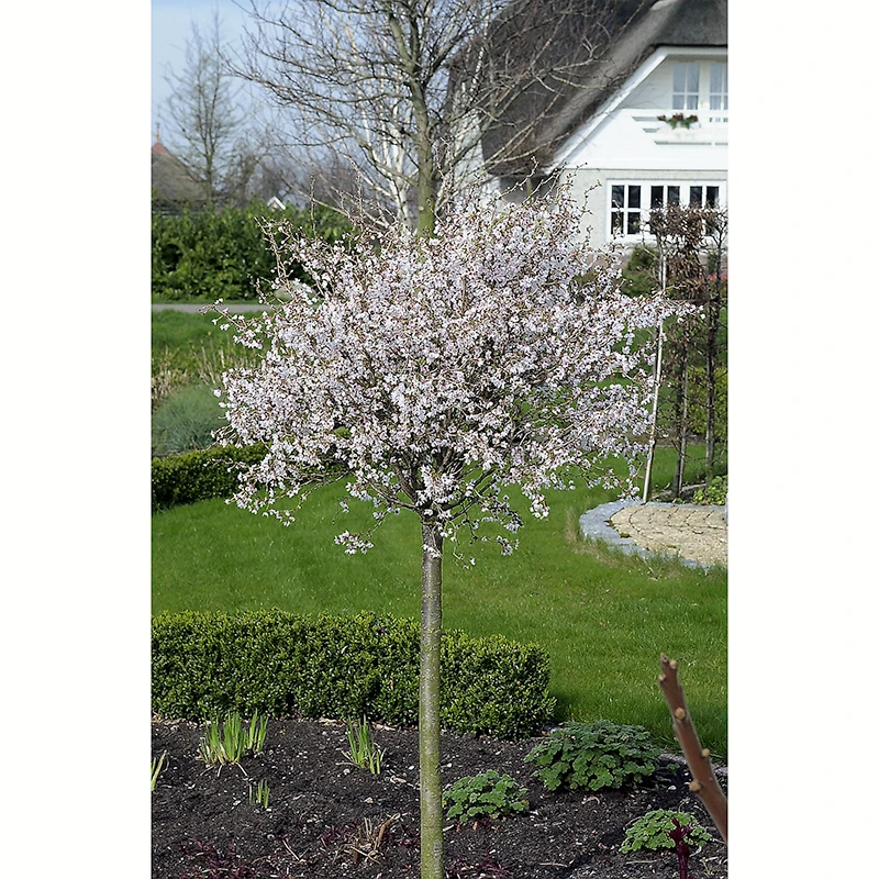 Dvärgkörsbär ‘Kojou-no-mai’ har dekorativa snirkliga grenar som ger ett magiskt och levande intryck. Dess fantastiska rosa blomning på bar kvist och mörkgröna blad gör det ett mycket odlingsvärt litet prydnadsträd. För att gynna blomningen så placera gärna i full sol och väldränerad näringsrik jord. Sorten är ympad på en svagväxande stam.