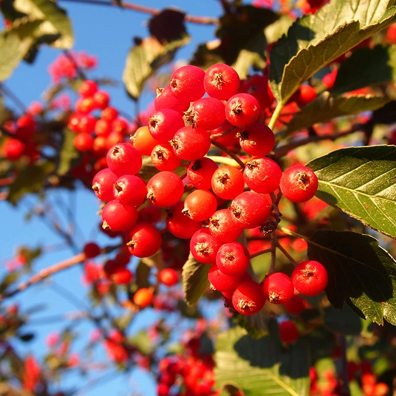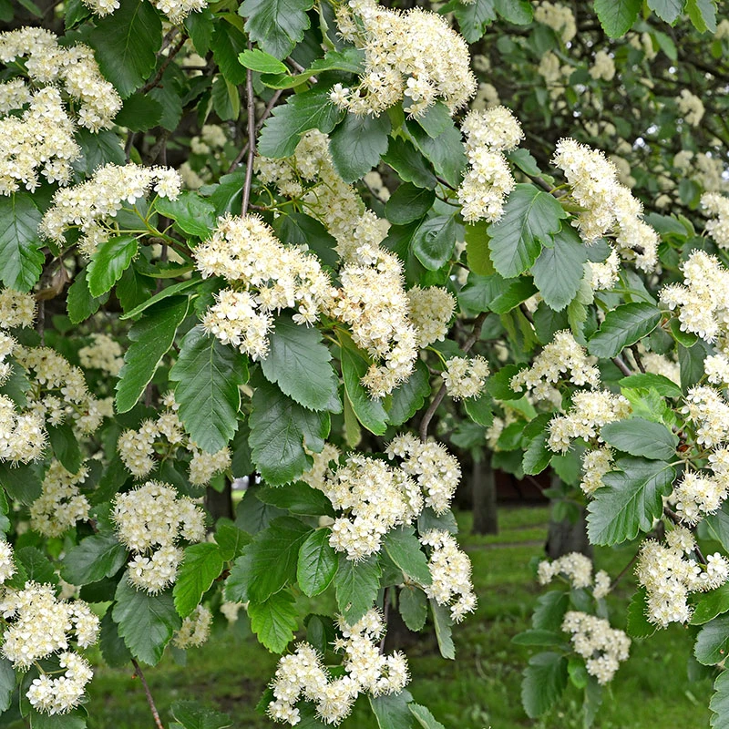 Oxel eller “Swedish Whitebeam” växer vild i många delar av Sverige. Stort, tåligt träd med rund tät förgrenad krona. I maj-juni blommar med flockar av vita små blommor som lockar mycket insekter och fjärilar. På hösten kommer orangeröda bär som äts av fåglar. Tål vind, salt och torka och trivs nästan överallt. Prefekt träd till ett blåsigt läge. Passar i stadsplaneringar, alléer och även för att användas till häckar.