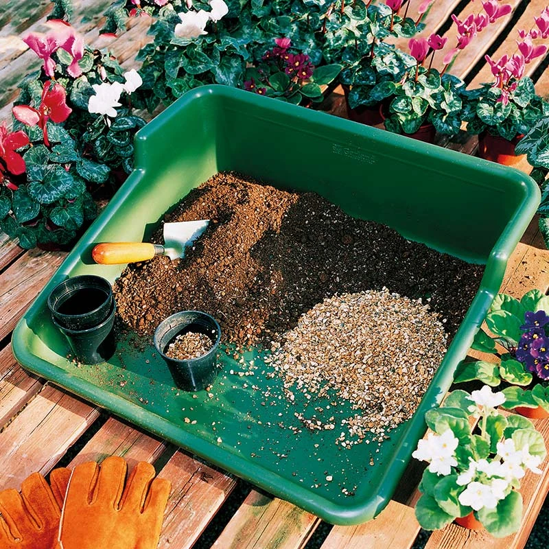En praktisk planteringsbricka i kraftig plast med sarg som underlättar planteringsarbetet.