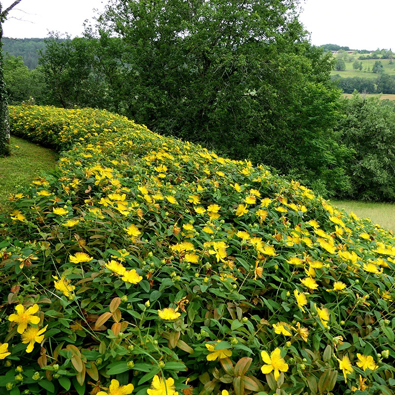 Prakthyperikum Àr en vacker marktÀckande perenn med lysande gula blommor. Vintergrönt bladverk som bör tÀckas över för att hÄlla sig fint. BeskÀrning Àr inte nödvÀndig men om den blivit brun kan man klippa ned den till ca 15cm höjd under vÄren och den blir fin igen.