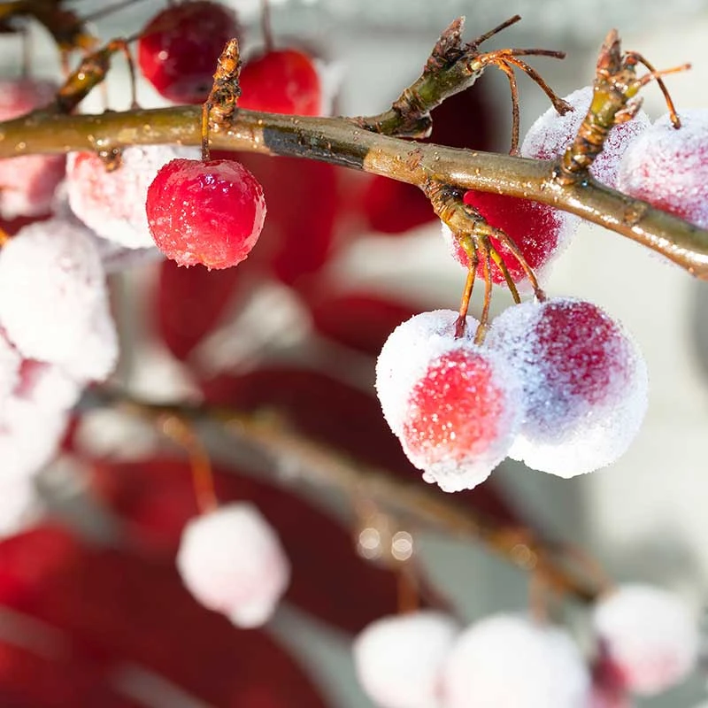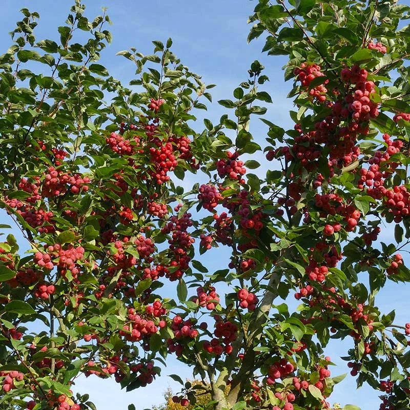 Blommorna utvecklas på hösten till röda frukter i mängd som ofta tynger ner grenarna på yngre exemplar och ger ett hängande grenverk.