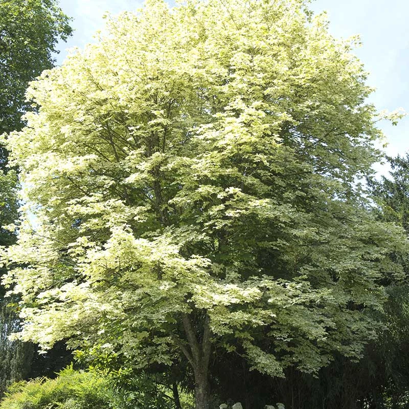 Vitbrokig skogslönn ‘Drummondii’ är en mellanstor skogslönn. Förtrollande och mycket annorlunda bladverk gör att denna lönnsort prydnadsfullt särskiljer sig från de vanliga då dess bladverk har en fängslande batikstruktur i crème/vit skiftning. Färgen kan beskrivas som olja möter vatten och ett osymmetriskt mönster i bladkanterna där cremèvitt och grönt möts. För att få de vita kantbladen att bestå beskär bort de grenar som eventuellt inte bär på den typ av blad. Ibland kan bladen återmutera till rent gröna färger. Sorten är mycket vindtålig. Passar utmärkt för plantering som solitär. Trädet finner sin perfektion antingen i val av plantering för att rama in arkitektoniska ytor eller varför inte placera på rad för ett stilrent och elegant uttryck.